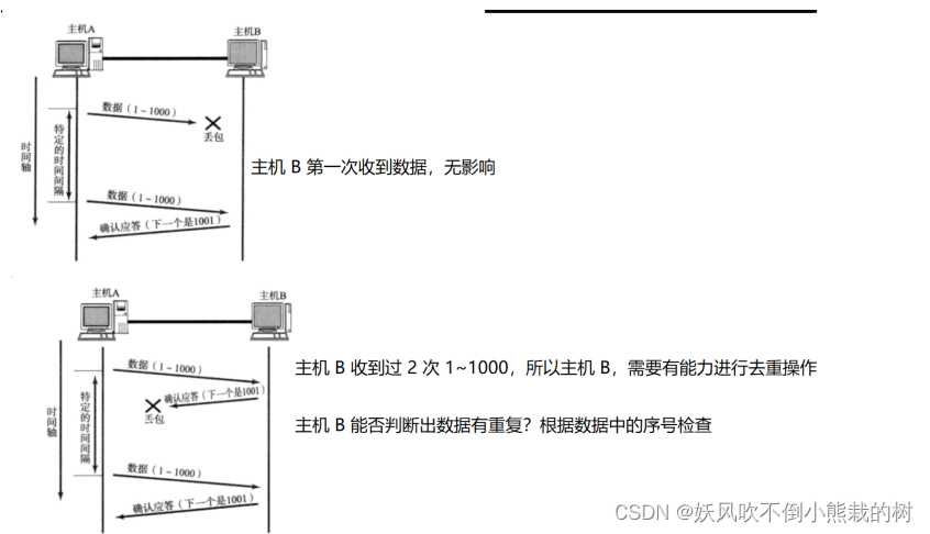 在b的例子中,只有答案丢失了, 所以我重新传送了数据, 接收端得到了两个数据包, 表明接收端需要有能力 完成重操作。