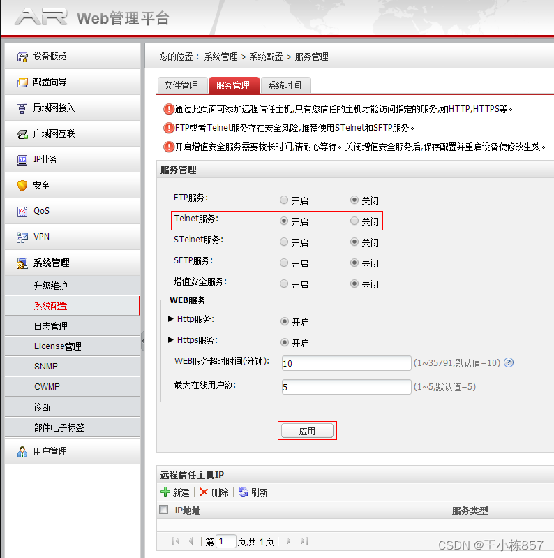 系统配置>服务管理",进入服务管理界面;选中"Telnet服务"对应的"开启"按钮,单击"应用"。选择"用户管理..." />