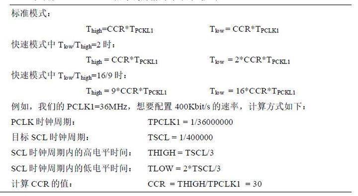 计算结果得 出 CCR 为 3 0 要控制, 请将此值写入此登记槽 。 制 IIC 的通讯速率 为 400KH z ,其实即使配置出来 的 SCL 时钟不完全等于标准 的 400KH z , IIC 传输的准确性将不受影响,就象所有数据通信一样。 由 SCL 只要保持时钟频率,它就得到协调。 偏差不要太大就行 。