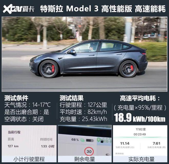 高速能耗测试期间,平均车速为82km/h,室外温度介于14-17℃之间。在按照固定路线行驶127km后,表显剩余电量为68%,手机在授权充电点充电充满需要46分钟,最终充电量为25.43kWh。