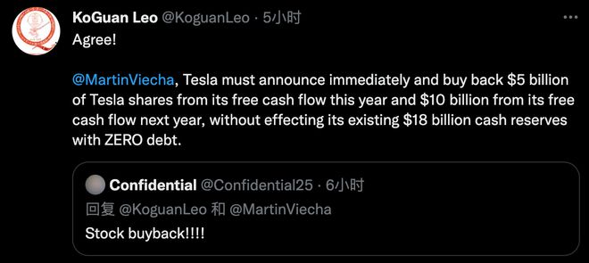 新加坡居民Martin Viecha在Tesla的投资者关系高级主任Tesla的推特上声称, Tesla应立即宣布打算今年再买回50亿美元, 明年再买回100亿美元。