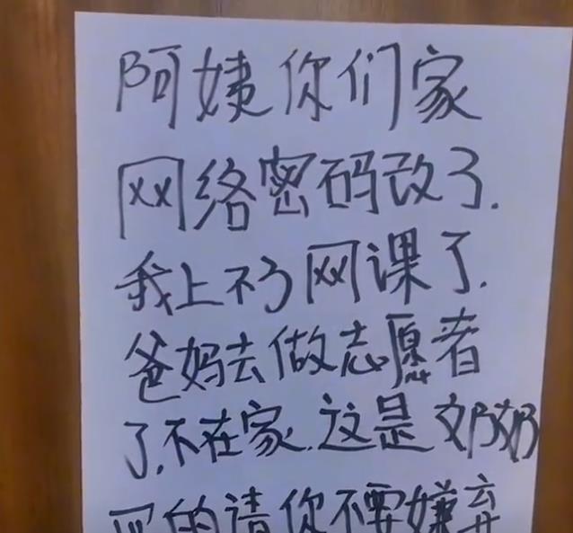 近日,上海Netizens发布视频。写在一张A4尺寸的纸上“女士,你的互联网代码被更改了,”它写道。我上不了网课了,爸妈去做志愿者了,不在家,那是奶奶的,请不要放弃,我不知道我该怎么办乍一看,我相信是熊孩子 无法进入邻居家他鼻子脸上的抗议但我想到了别的东西