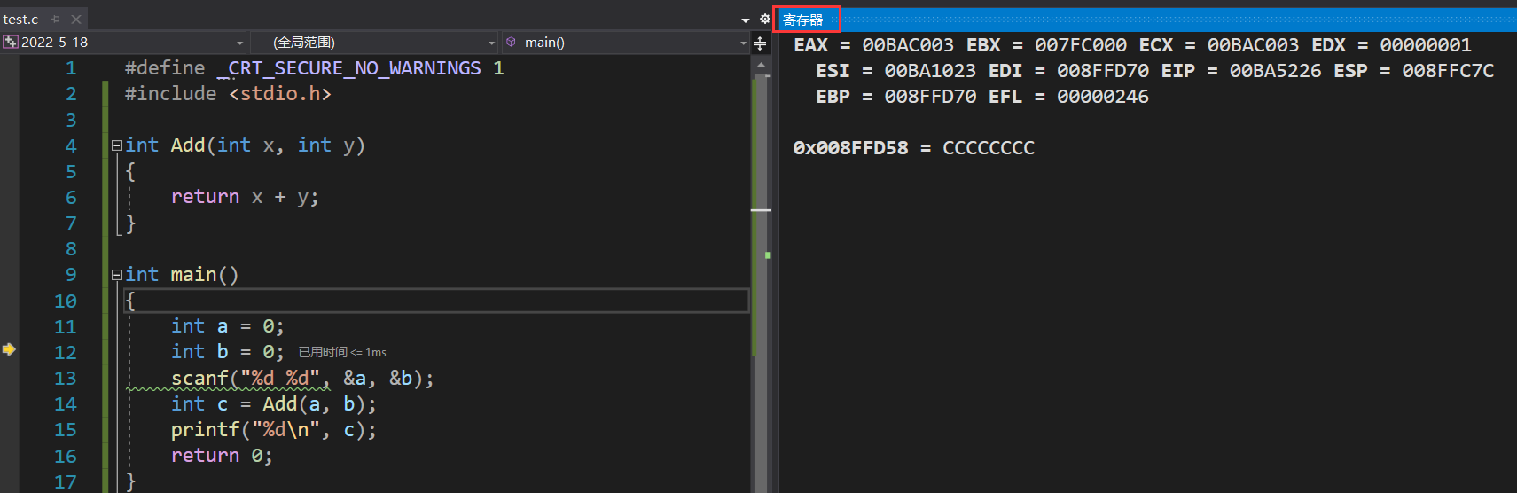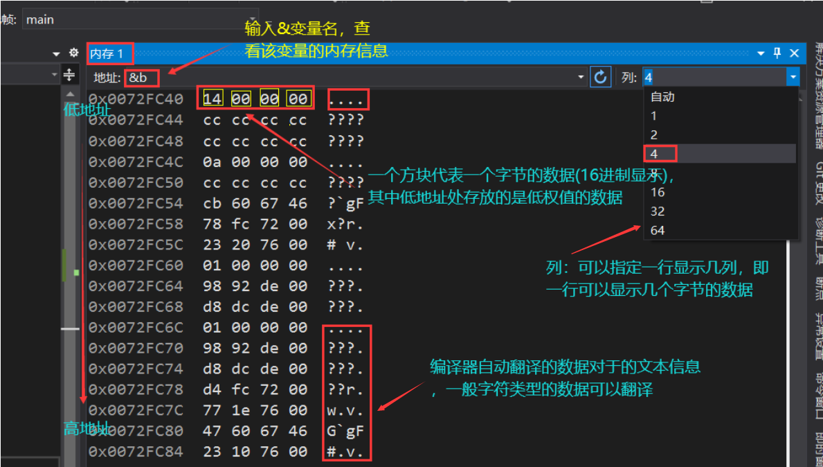 F10进入调试状态 -> 调试 -> 窗口 ->内存。