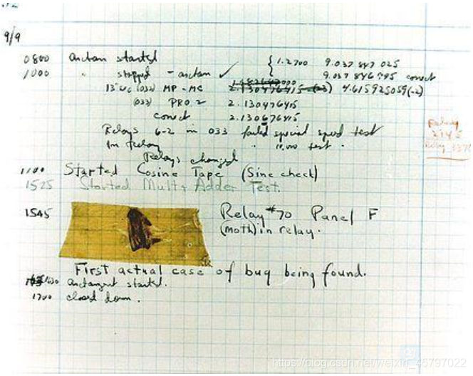 Bug的创造者Grace Murray Hopper写道:他是美国海军的电脑专家此外,他是最早将人文纳入计算机程序的国家之一。“ bug” 一词指失败的计算机程序的名称。正是由 赫柏 所取的。1947年9月9日 1947年9月9日哈佛马克二号 赫普哈德编码了1700个中继器技术人员在操作整台机器时它突然停止了工作。于是,他们升起来,看看为什么。在这个庞大的电脑里 发现了一个飞蛾 在庞大的继电器的触角之间很明显 飞蛾被引向光和热飞到了触点上,然后被高电压击死。所以在报告中,赫伯特在飞蛾上涂了胶水“计算机程序错误”是指“计算机程序错误”。今天还用"巴格"这个词