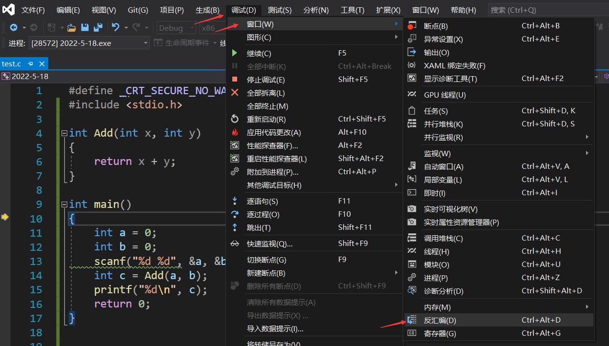 F10进入调试状态 -> 调试 -> 窗口 ->反汇编。