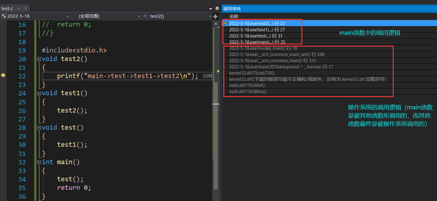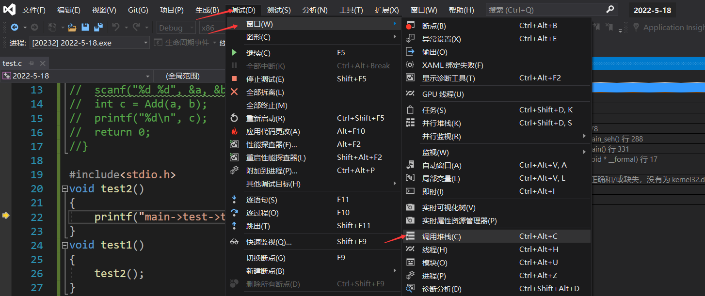 F10进入调试状态 -> 调试 -> 窗口 ->调用堆栈。