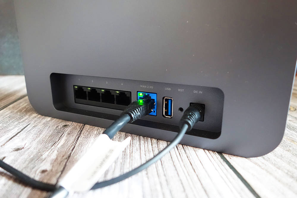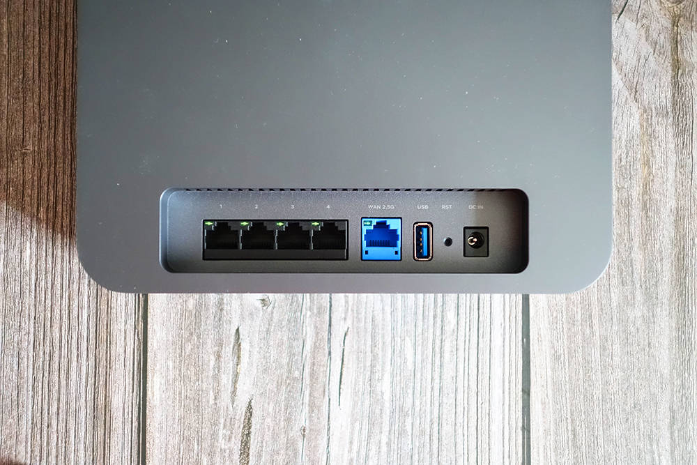 接口方面,无线宝藏AX6600雅典娜包含一个自适应的10/100/100/2500M广域网嘴(蓝色)。4个黑色10/10/10/100 M 局域网。USB 3.0接口以及更换孔和电源连接器
