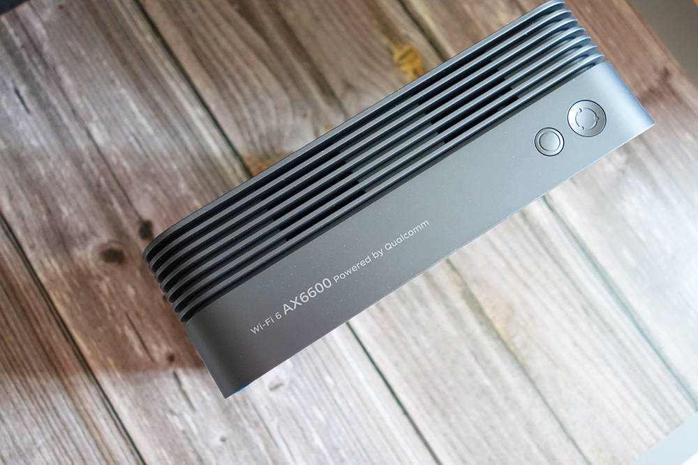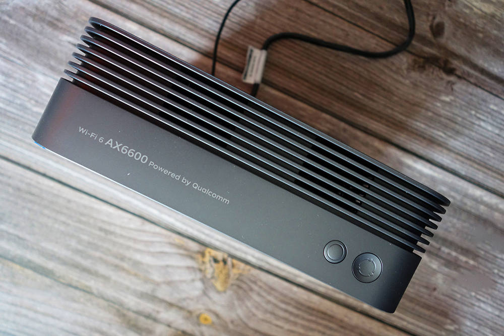 无线宝藏 AX6600 的外壳不仅舒适,而且还释放了金属光。主机顶部有两把钥匙,显示屏幕上的内容开关键和Mesh组网按钮,这些钥匙也可以用来调整灯光。
