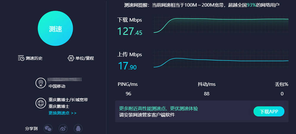 我家的宽带是100M重庆传输,随后是速测测试,下载率高达127.45兆位/秒,在目前能力下几乎达到最高速度。