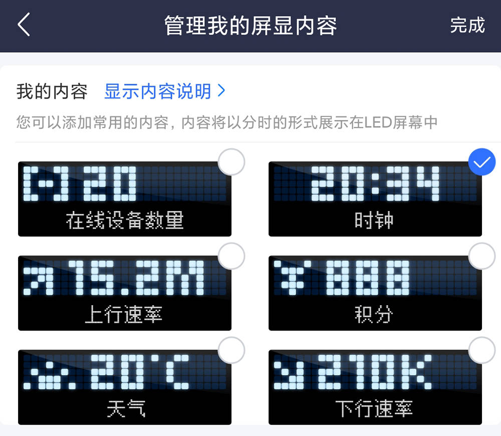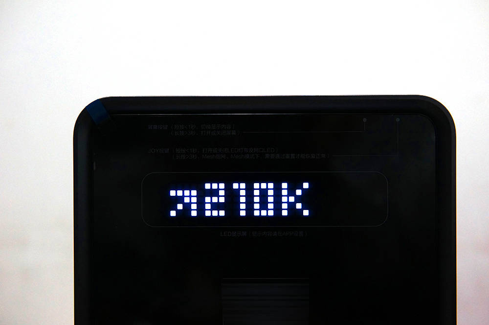 路由器的侧面有一个隐藏的 LED 点阵列面板, 显示信息, 如在线设备数量、 时间、 上移速度、 下调速度、 分数和天气 。 屏幕上的字型是巨大的, 从远处可见 。