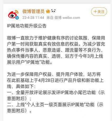 Weibo改进并引进了全新的能力,以展示于3月28日正式启用的IP领土特征,该功能于4月28日启用。 将在“个人主页个人数据”微尾片上发表全面的公开评论,并在网上发表“个人主页一级”的特征。