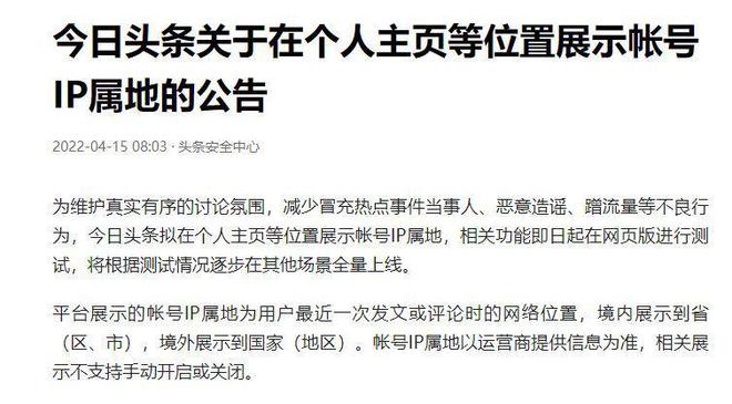 4月15日的字节宣布, 国旗和今日头条下的“电动”将按IP账号属地性来显示。