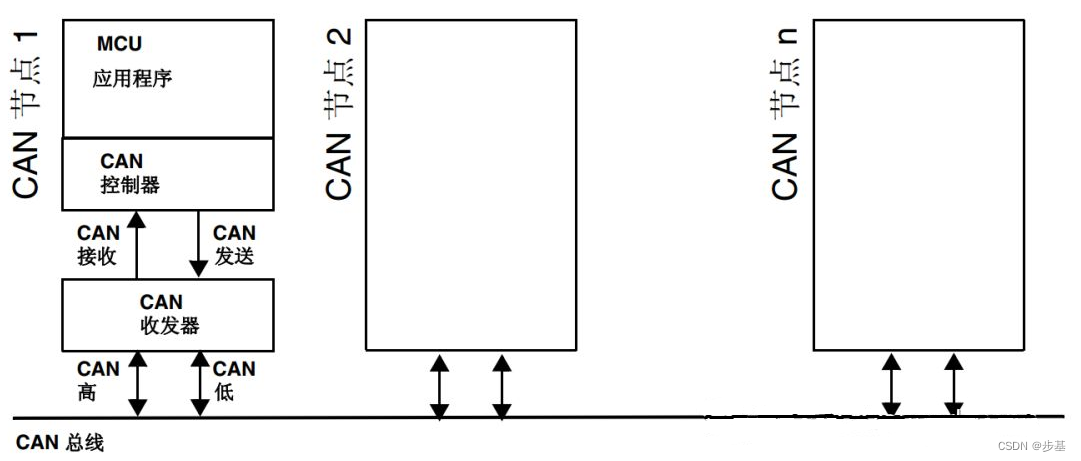 CAN节点由三个主要部分组成:MCU应用程序、CAN控制器和CAN收发器。