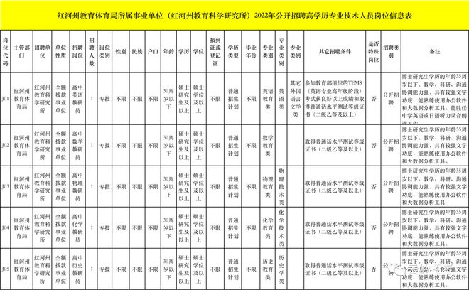 更多信息见红河州教育和体育部(红河教育科学研究所)《2022年高等教育专业技术员公开招聘情况表》(附件一)。