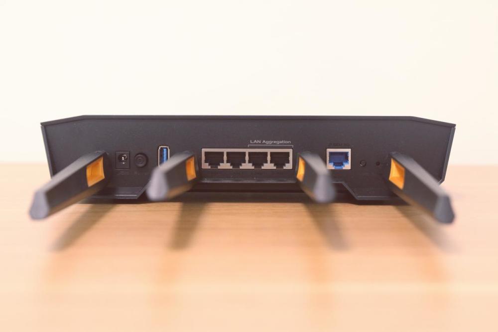 它位于小气旋路的尽头主界面在此创建 。DC供应、开关、一个USB3.1gen1扩展界面、四个局域网/广域网接口、门户、WPS键和替换键从左向右显示。蓝色局域网/广域网港口支持2.5GbE。要在外部网上运行 用户需要100米光纤还可以用作局域网内联网节点港。此外,USB3. 1gen1扩展号允许用户扩展USB储存或打印机设备。