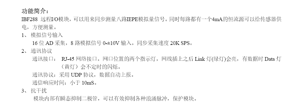 IDF288系列是根据工业标准开发和建造的。抗干扰能力强,可靠性高。工作温度范围为45°C至85°C。 IMF288系列有动力调制解调器、模拟体积同步收集、连续流源输出和RJ-45网络接口通信。通信使用UDP协议完成。用户可以配置模块IP地址、子网遮罩和其他参数。