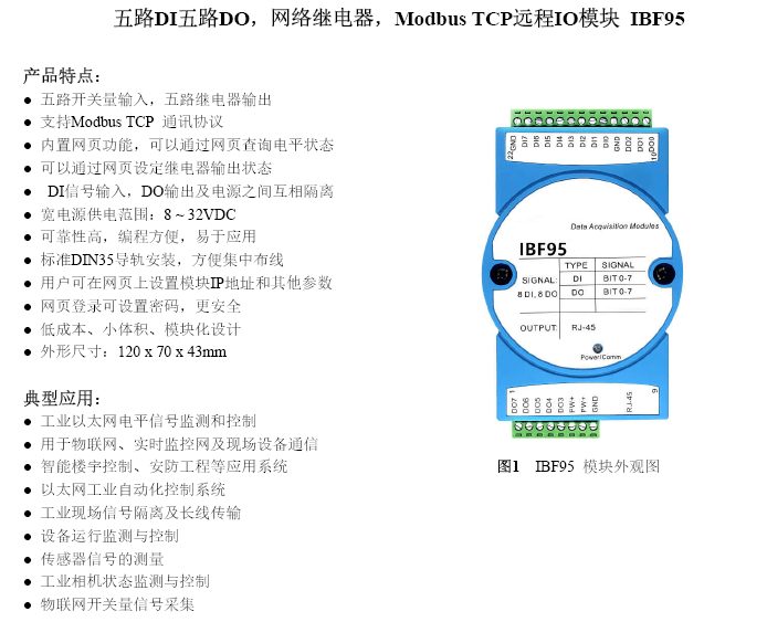电调制解调器属于IBF95设备。收集开关、中继输出和RJ-45网络接口通信MODBUS TCP协议用于通信。转让层协议是TCP的基础。它是使用广泛,可靠的连通协议用户可以直接在自己的网站上使用模块的 IP 地址、 子网络遮罩等, 来绘制模块的 IP 地址、 子网络遮罩等 。它可用于在操作期间监测和操作传感器设备。