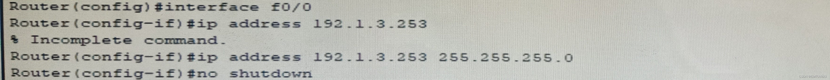 (4) 切换到接口F0/0的全球模式;在配置- if 中输入 IP 配置 f0/ 0 界面的 IP 地址和子网遮罩。下一步,打开接口(例如,第三个路由器),输入不关闭。