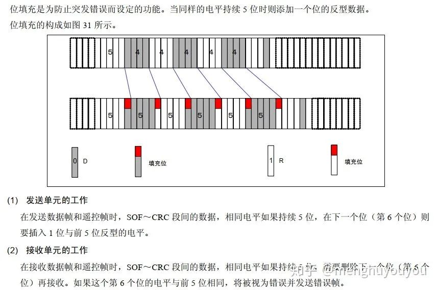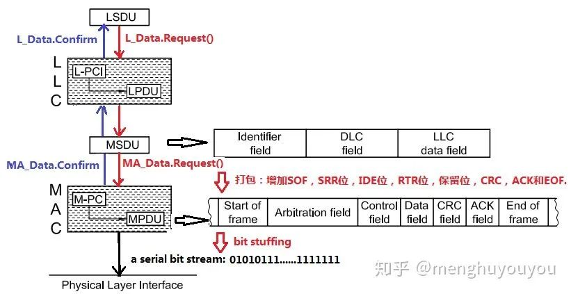 数据包,包括:接收LLC数据框架,计算CRC序列,建立MAC数据框架(即SOF、SRR、IDE、RTR、保留、CRC、ACK和EOF加上LLC数据框架)。