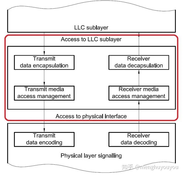 必须在发送方部分(数据包装和传送中位接入管理)实现MAC子层。