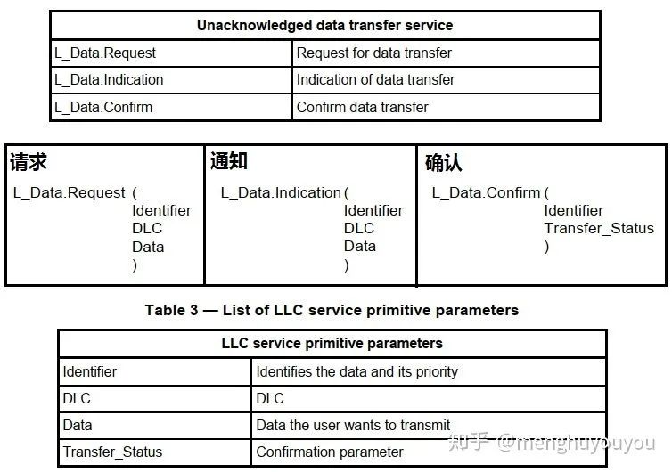 根据服务说明,我们知道。在传输数据时,LLC用户将数据传送到LLC子层,并要求LLC子层提供数据,确认向LLC用户的分布状态。在收到数据时,LLC分层通知LLC用户数据已经到达。每种服务语言的信息如何?图7显示了一个直截了当的定义。