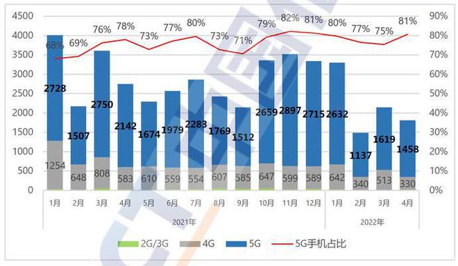对此,该主编前往信息和通信技术研究所(ICE)和中国信息和通信技术研究所(CICI),最近发表了《2022年4月国内移动市场运行分析报告》。报告中4月份,迷宫市场有1 807部手机 我不确定我能否做到其中,有1,458,5G移动电话,其中有50,00部。这相当于同期移动电话运输量的80%。2022年1月至4月国内市场的移动电话总数为87.42部,其中50 00部。其中,5G手机传送,6846这占同期移动电话运输量的78%。
