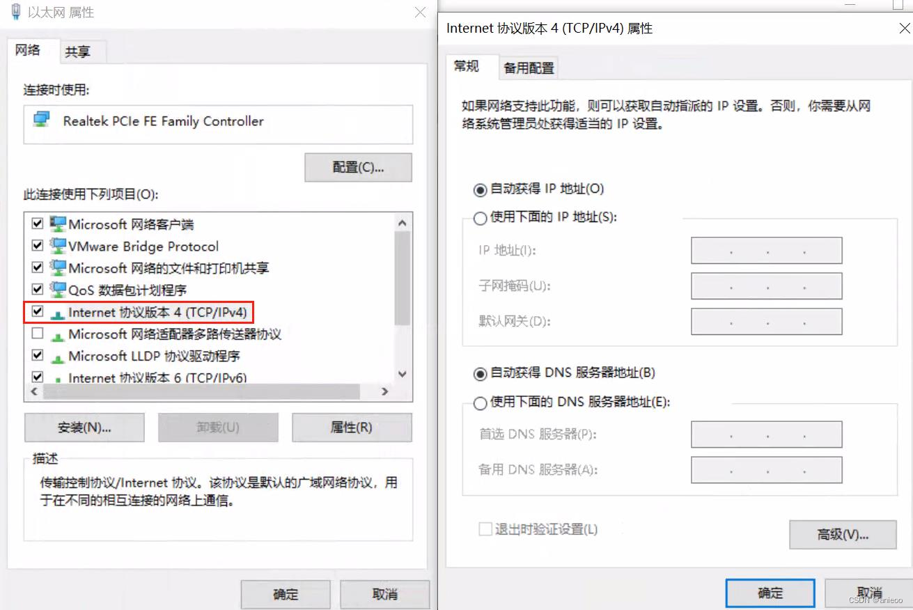 选择 Ethernet, 按右键打开菜单栏, 然后选择属性。 在打开的网络设置窗口中双击互联网协议版本 4 。