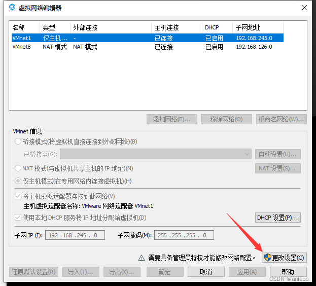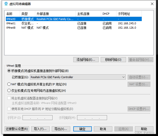 由于开发面板与计算机门户直接相连,虚拟网络编辑器中的网络适配器1(VMnet0)是必要的。