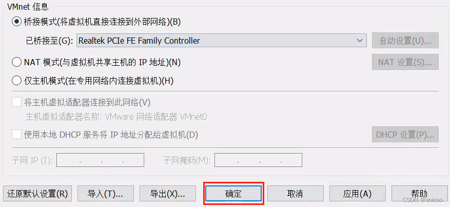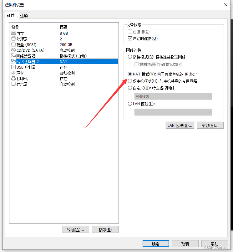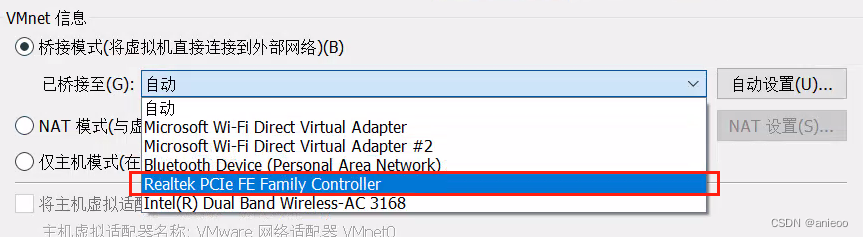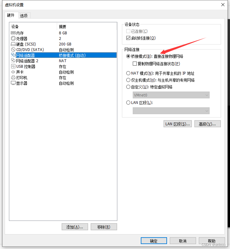 将网络适配器切换到桥模式 。后,会导致虚拟机无法上网,因此还需要建立一个新的网络适配器。并设置为NAT模式供虚拟机上网。
