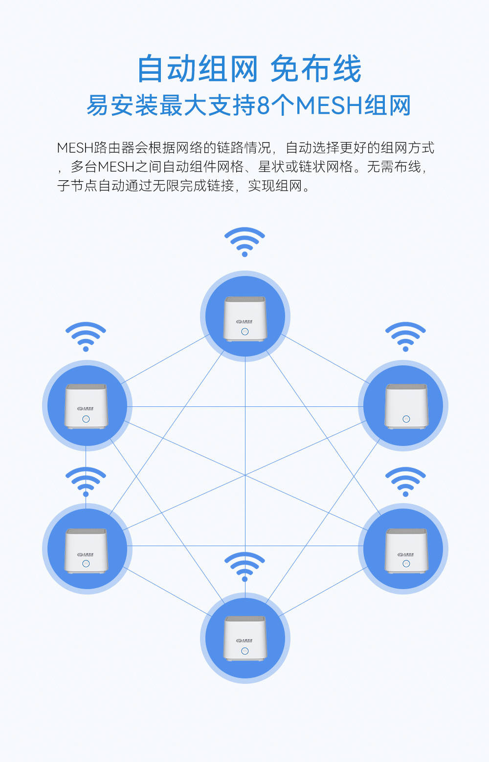 UXI MESH系统可处理多达8条线路连接,满足不同的家庭线路连接情况,并只需用一个密钥即可完成网络连接,使WiFi信号能够很容易地覆盖家庭无限制的MESH系统的每一部分,能够处理多达8条线路连接情况,满足不同家庭线路连接情况,并且仅用一个密钥即可完成网络连接,使WiFi信号能够很容易地覆盖家庭每个角落。