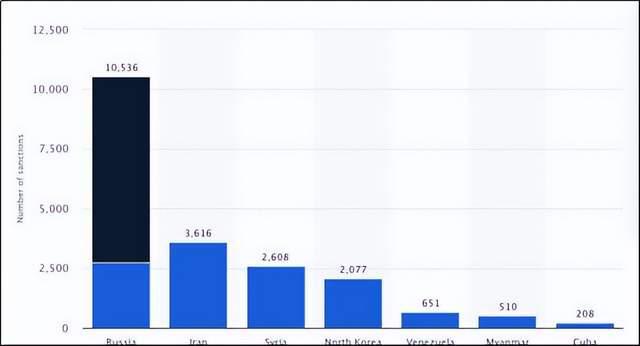 从2022年2月24日起,西方对俄罗斯实施了史无前例的制裁,在几周内将俄罗斯确立为制裁世界冠军。 所判刑罚总数已超过10,00次,是第二大伊朗的三倍以上。