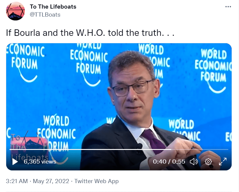 那么,Facebook上还有一段视频,究竟谁创造了它呢?我们在Twitter上寻找“Bourla depulation”等关键词。TTLBoats的Twitter用户。经核查,TTLBoats于5月27日北京时间凌晨3点21分张贴录像。"如果宝拉和卫生组织说的是真话"影片在左下角的左下角带有独特的个人徽章。