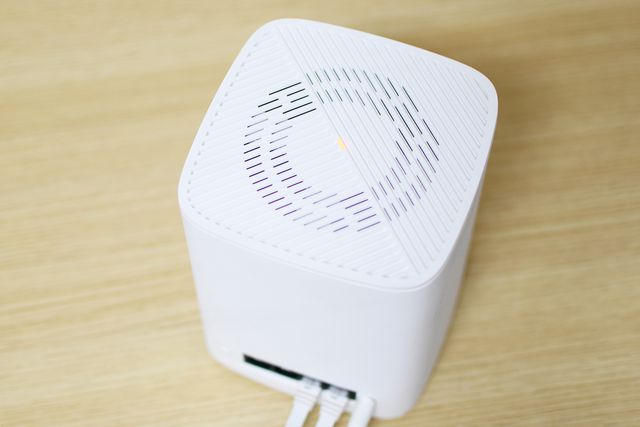 无线云路由设计在AX 1800底部,有一个圆形入口,与顶部散热孔形成散热通道,确保内部电路的稳定运行.顶部中心有一个RGBLED指示灯,不同的颜色代表不同的路由器状态。例如,黄色表示系统启动,红色表示外部网络切断状态,绿色表示正常外部网络。