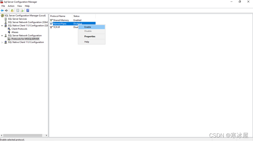 在详细信息面板(右面板)中,右键单击命名管道协议,然后单击“启用”来启用指定的SQL实例的命名管道。