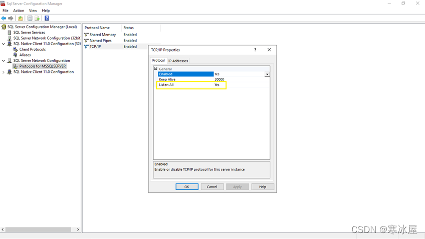 现在你可以看到TCP/IP属性窗口,单击“协议”选项卡,在“所有听”属性中选择“是”。
