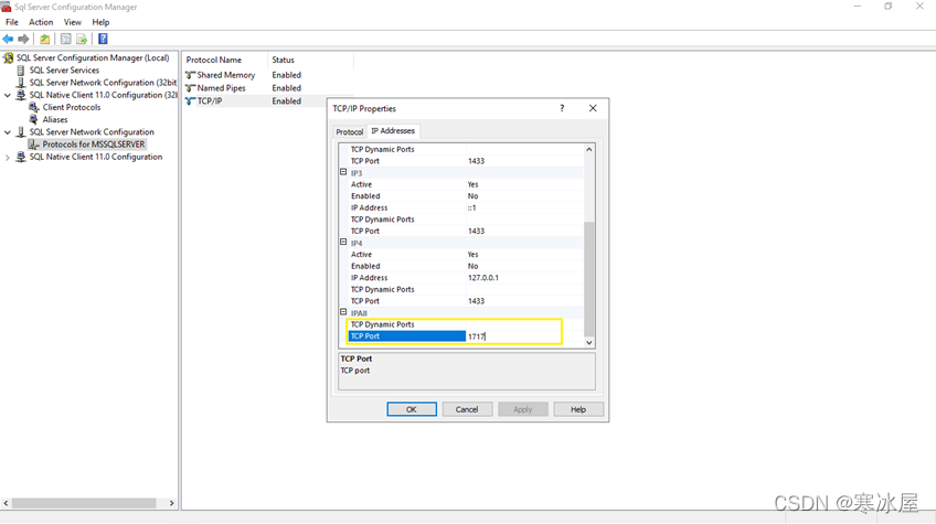 现在点击IP地址选项卡,滚动到IPAL部分。现在更改TCP动态端口属性的值为空.如果其值为零,然后数据库引擎会听听动态端口。接下来,在TCP端口属性中,输入您希望此IP地址被听见的端口号码(在我的例示1717),然后单击OK按钮。也可以用逗号分隔多个端口来指定它们。