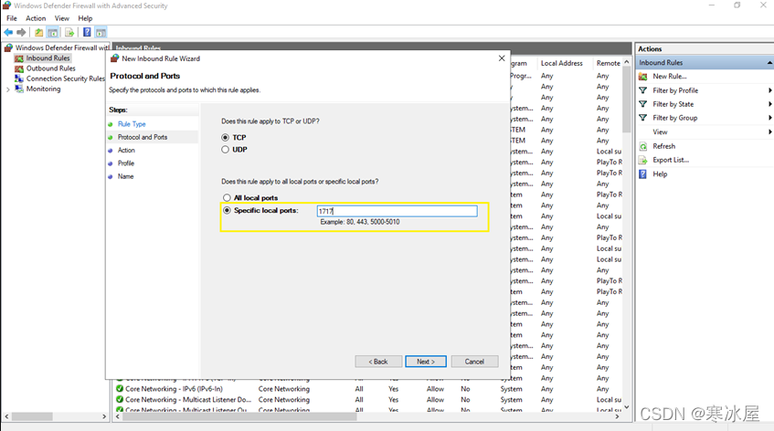 在协议和端口步骤中,选择一个特定的本地端口,并在文本框中输入我们的SQL端口1717,然后单击下一个按钮。