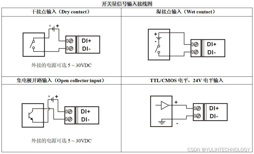 输入类型: 开关输入, 4 通道 (DI0~DI3).