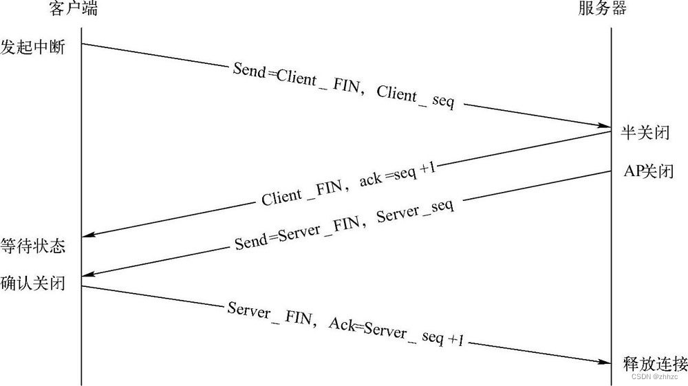 第三次握手:客户维护以确认序列号码,输入服务器的ISN加上1来确认服务器。若正确,再次确认ISN和ack加1,服务器收到重新确认后,链接建立成功。当数据传送完成后,进行释放连接,现在需要四波,如图7-5所示