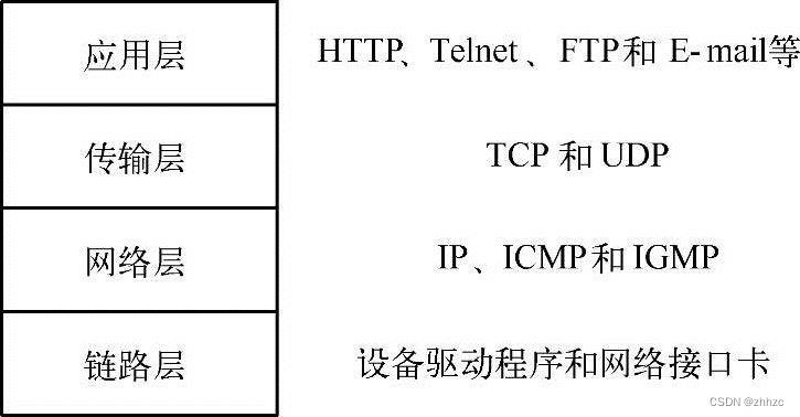 TCP/IP是一个在不同层次的多个协议的组合,它使用四个层级协议进行层级化,每个层负责不同的系统功能,如图7-2所示