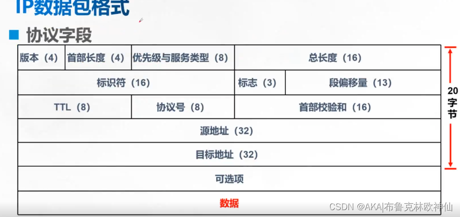 (IP头条数据段可为20或以上字节,总长度加数据段长度。)最大65535字节)