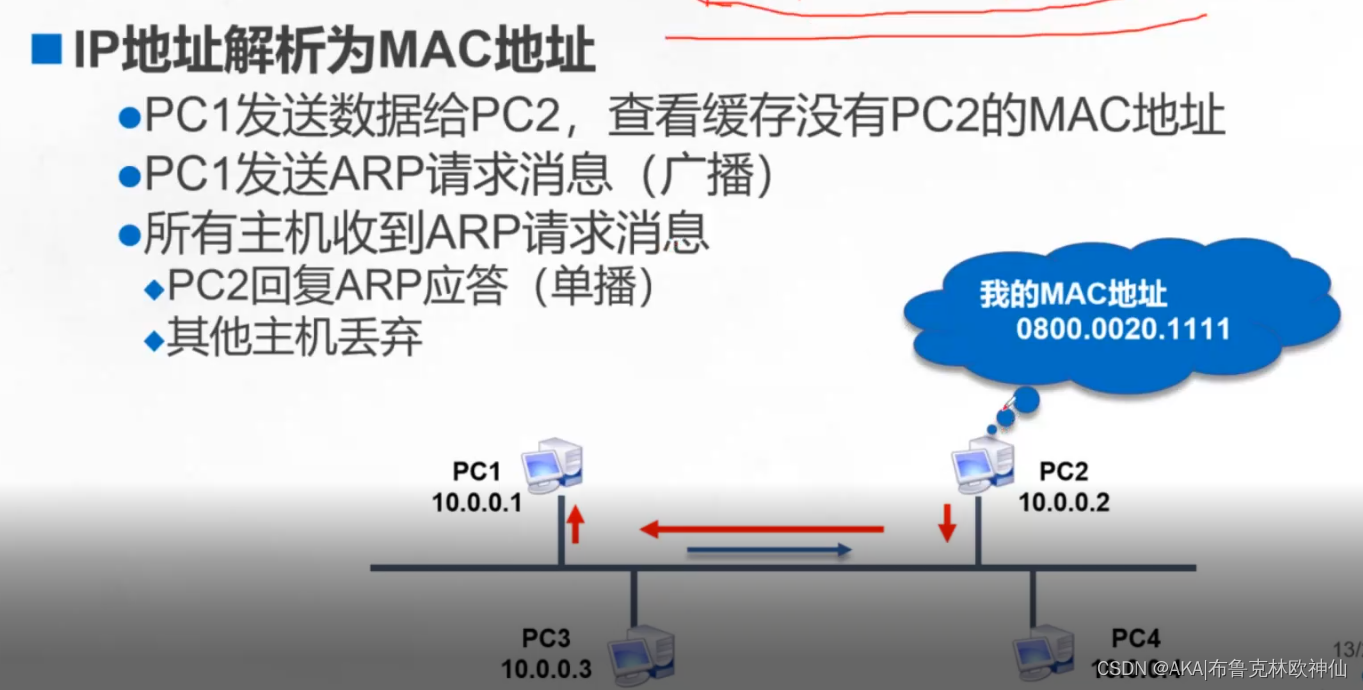 (4)主机PC2将直接向主机PC1发送包含MAC地址的ARP响应消息(数据帧是单播)。
