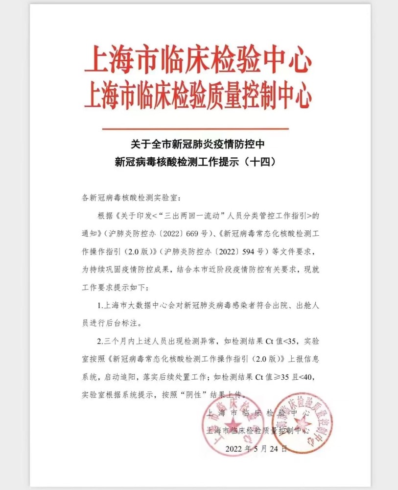 2022年5月14日上海临床检查中心已向新作物病毒核酸检测实验室发出「城市新作物肺流感预防和控制新作物病毒核酸检测指引」。三个月内,新型冠状肺炎病毒感染者必须遵守医院外和舱外人员的检测异常,例如,测试结果是Ct值