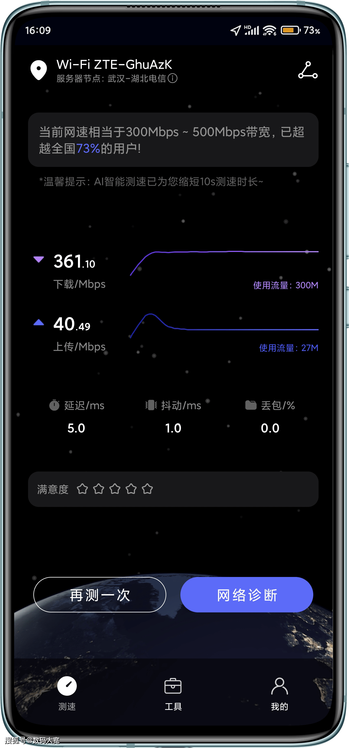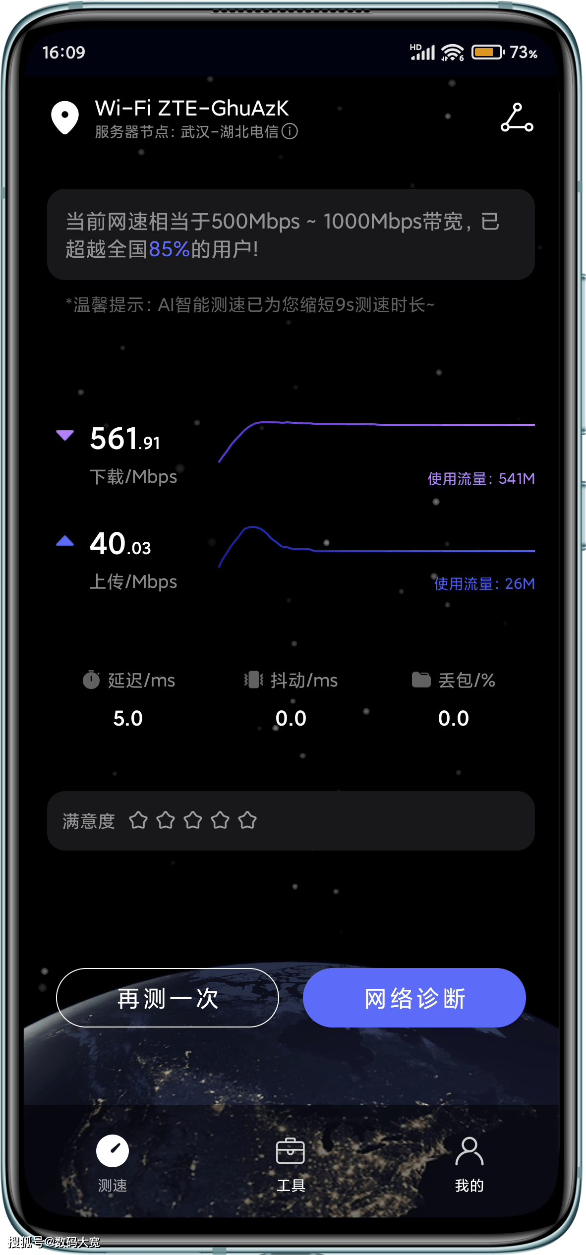 由于入口是 lobby,这个区域可以被称作最好的信号,速度在无障碍的 lobby中测量,底线达到600Mbps,非常夸张,最初给出的电信宽度非常充足和冗余,所以没有惊奇地耗尽这个速度。