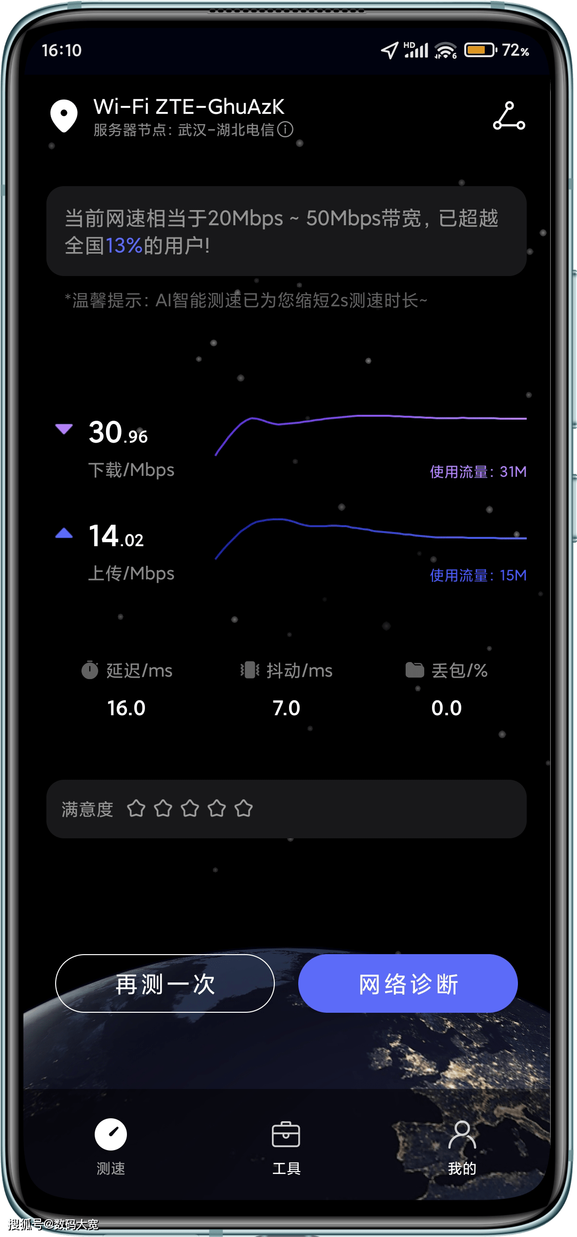 房子的房间至少隔开两堵墙,路由器完全覆盖着死角,到处都有网络问题。现在直接出门,测试下极限的状态。关上门往下走一层,差不多在隔壁的门边,感觉已经到了极限,它能够检测30Mbps下调和14Mbps上调,延迟也有所增加,即使有信号,它也不会通过网络。我对这个结果非常满意。