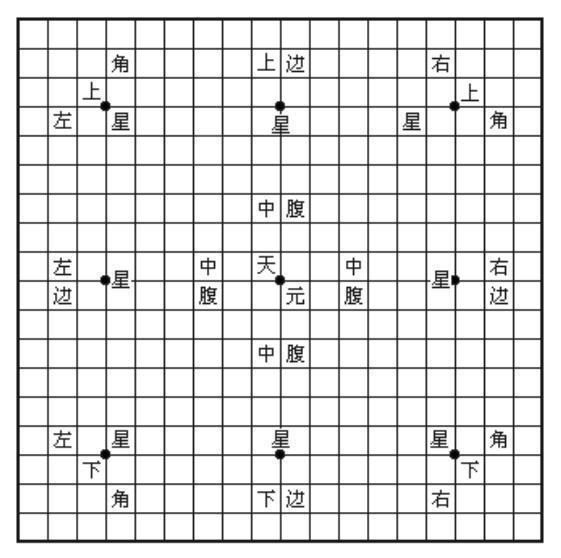 让我们看看棋子本身。 有19个水平和垂直板,水平和垂直板的交叉点叫做交叉点。 九个特殊的交叉点叫做“星位”,而中心位置是“天体”。