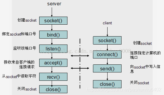 如果服务器调用索克()或绑定(),听()到索克,如果客户端调用连接()发送连接请求,服务器端接收请求。