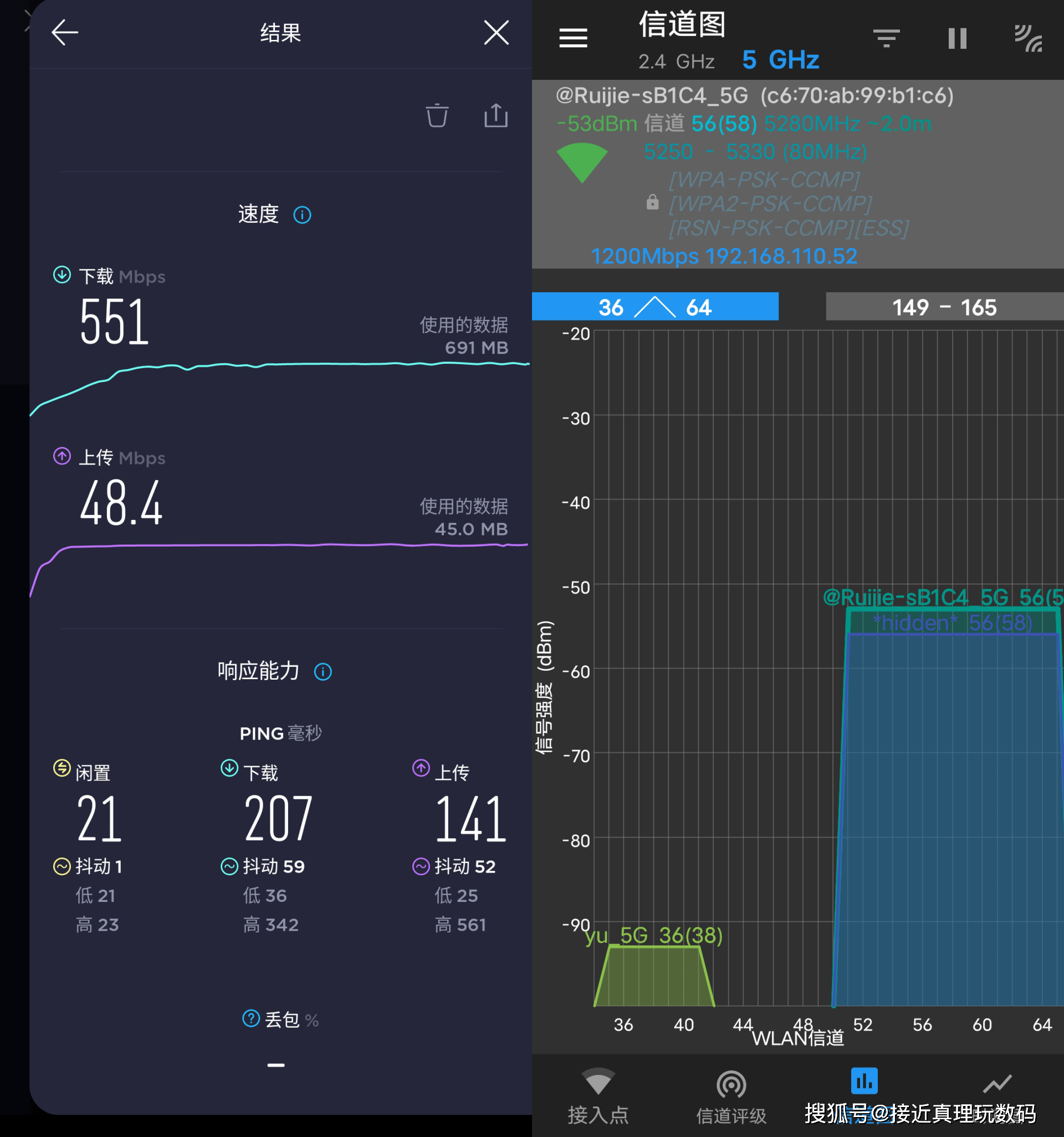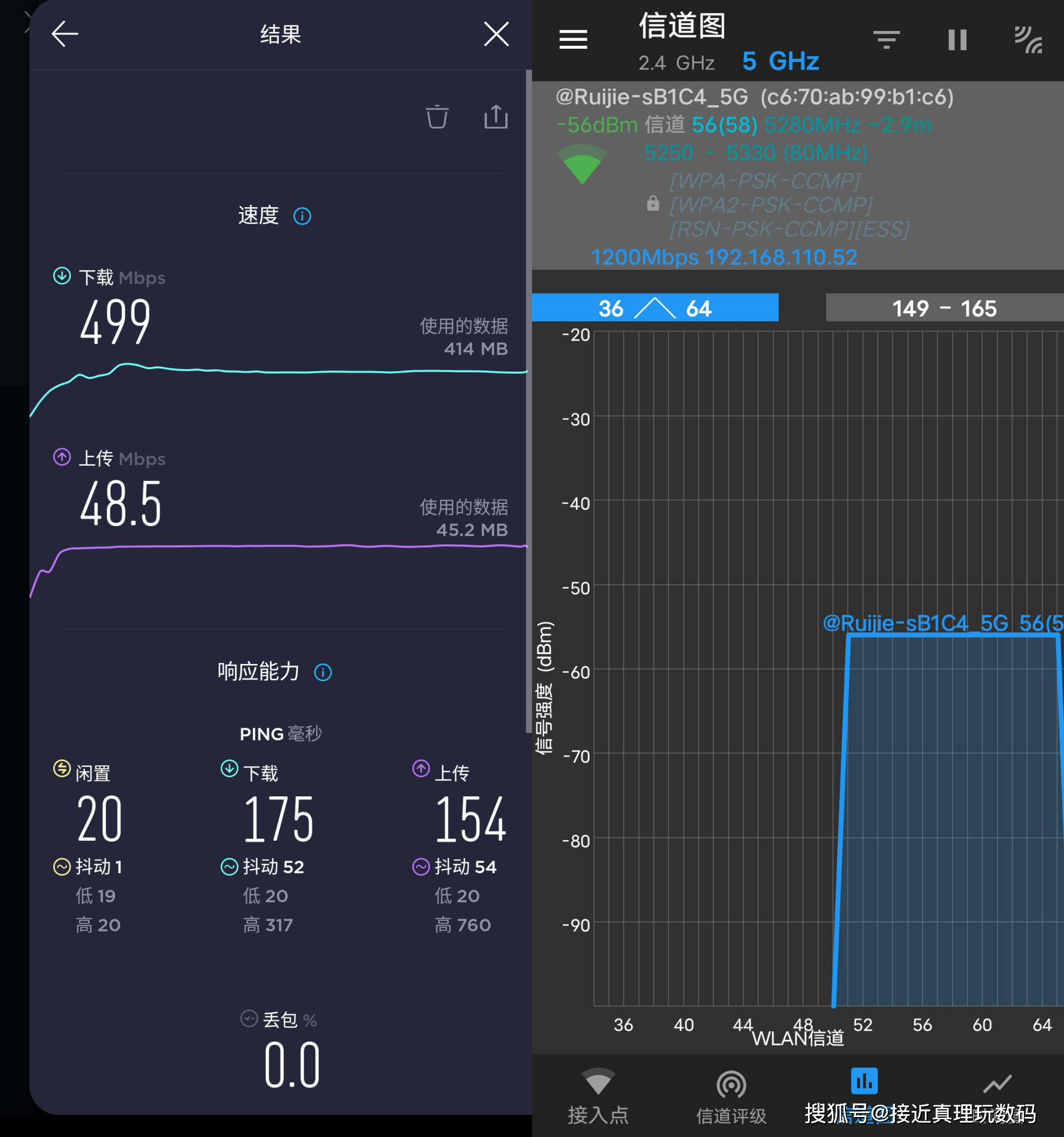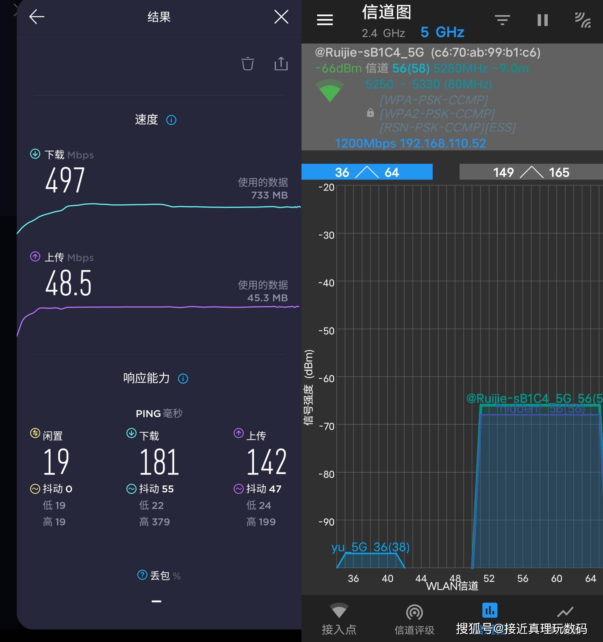 在测试时,手机被连接到5G带,A端口的无线信号强度为-66dBm,整体性能良好,下载速度达到497Mbps。