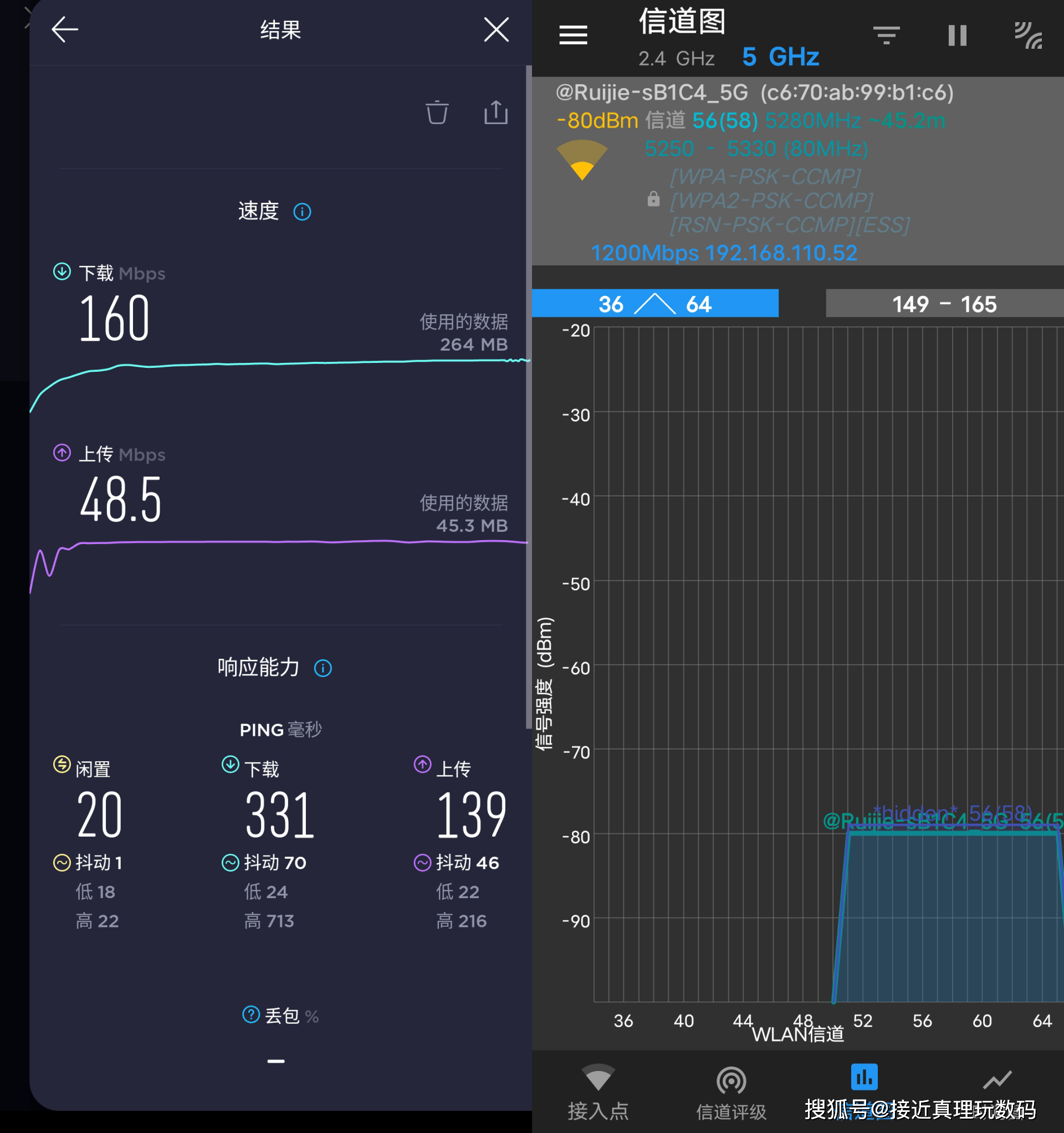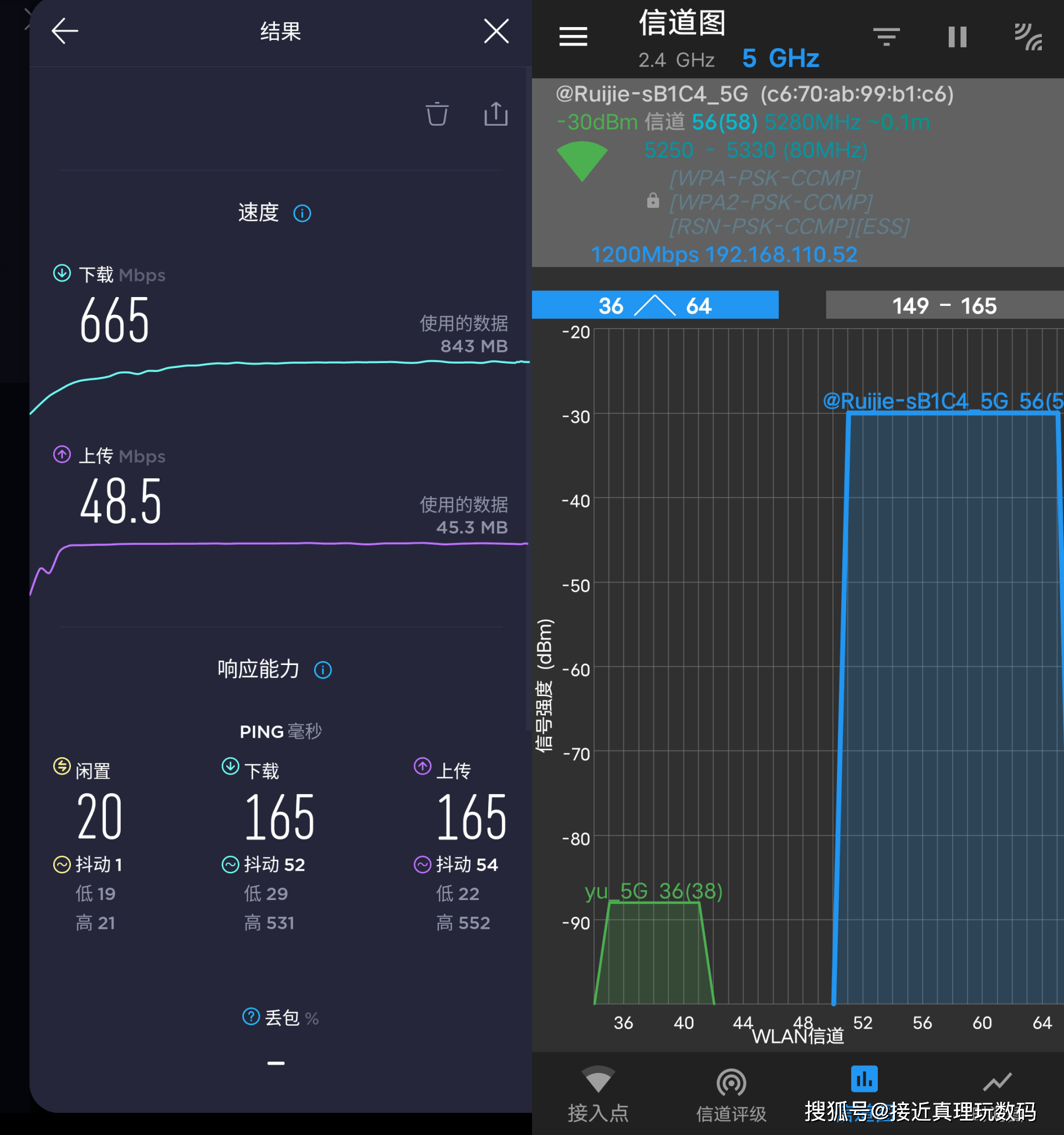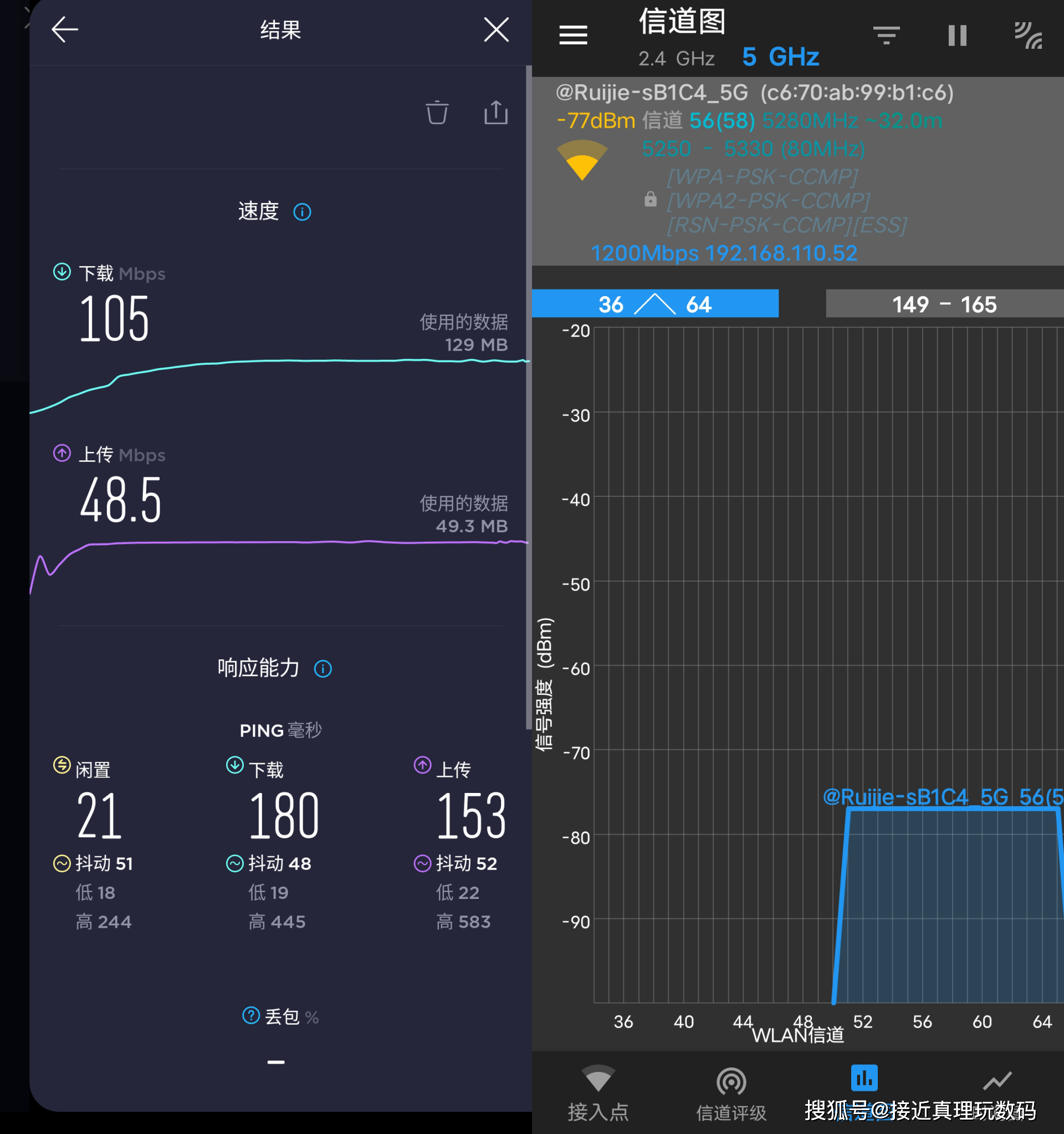 在测试时,手机被连接到5G带,A端口的无线信号强度为-66dBm,整体性能良好,下载速度达到497Mbps。