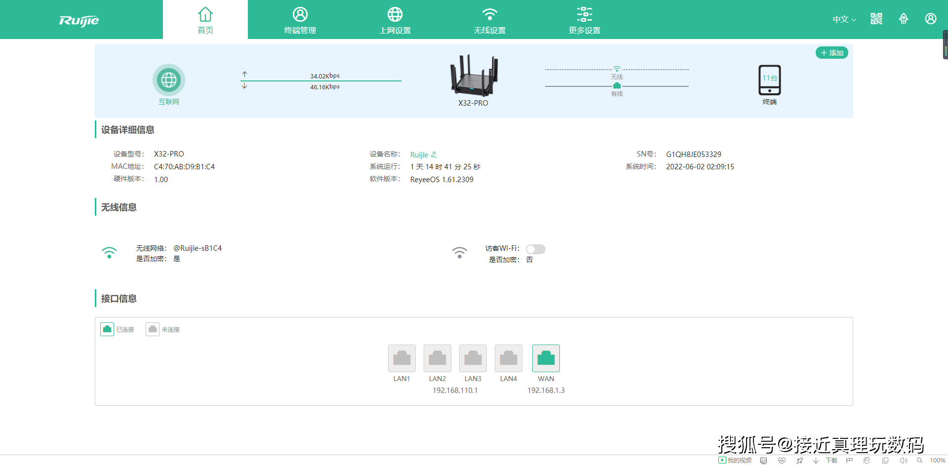 首次使用路由器,用户需要在网页末端执行相关操作。你只需要设置一些简单的步骤,如路由器管理页面的登录密码、WiFi密码和如何连接到互联网,可实现移动设备的互联网访问。进入快速星YaoX32 PRO管理接口后,用户可以在主页上实时查看当前网络连接状态、网络速度、端口信息等,快速了解设备的运行情况.在整个页面设计中,锐捷也进行了简化。除首页外,该机器还具有终端管理、互联网设置、无线设置和更多的设置四页,它易于第一次使用。